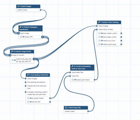 This workflow is the integration of YOLO (You Only Look Once) machine learning models, image pre-processing scripts and labeling tools within the Galaxy platform. Galaxy is an open, web-based platform used primarily for data analysis in computational biology, but it also has applications in image processing and other fields.